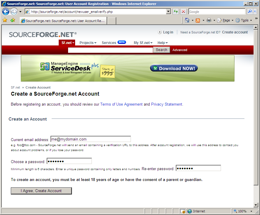 If you are not yet register with SourceForge.net, go to the following page and signup for a new account: